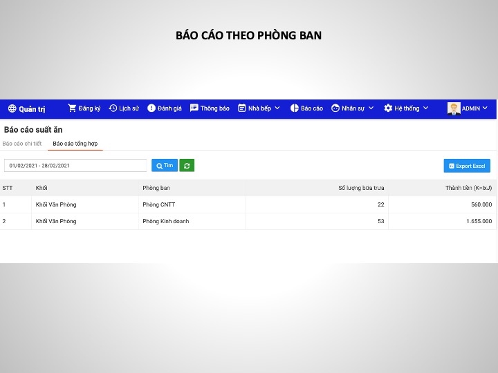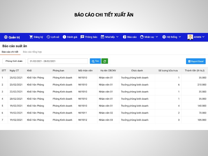 7. Smart reporting: The system offers the ability to generate lunch registration reports by quantity and amount. This helps management have an overview of the registration and lunch consumption situation.